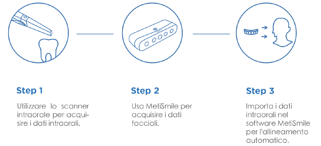 In soli 10 secondi questo scanner altamente percettivo può scattare foto di pazienti da più angolazioni per ricostruire istantaneamente i dati facciali 3D. Tre telecamere di acquisizione dati da 1,3 MP e una telecamera texture HD da 5,0 MP garantiscono una precisione di scansione entro 50 μm. MetiSmile acquisisce inoltre i denti in modo molto dettagliato.